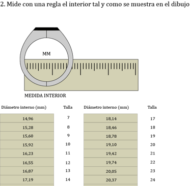 Después, usar la tabla abajo para encontrar tu talla perfecta.